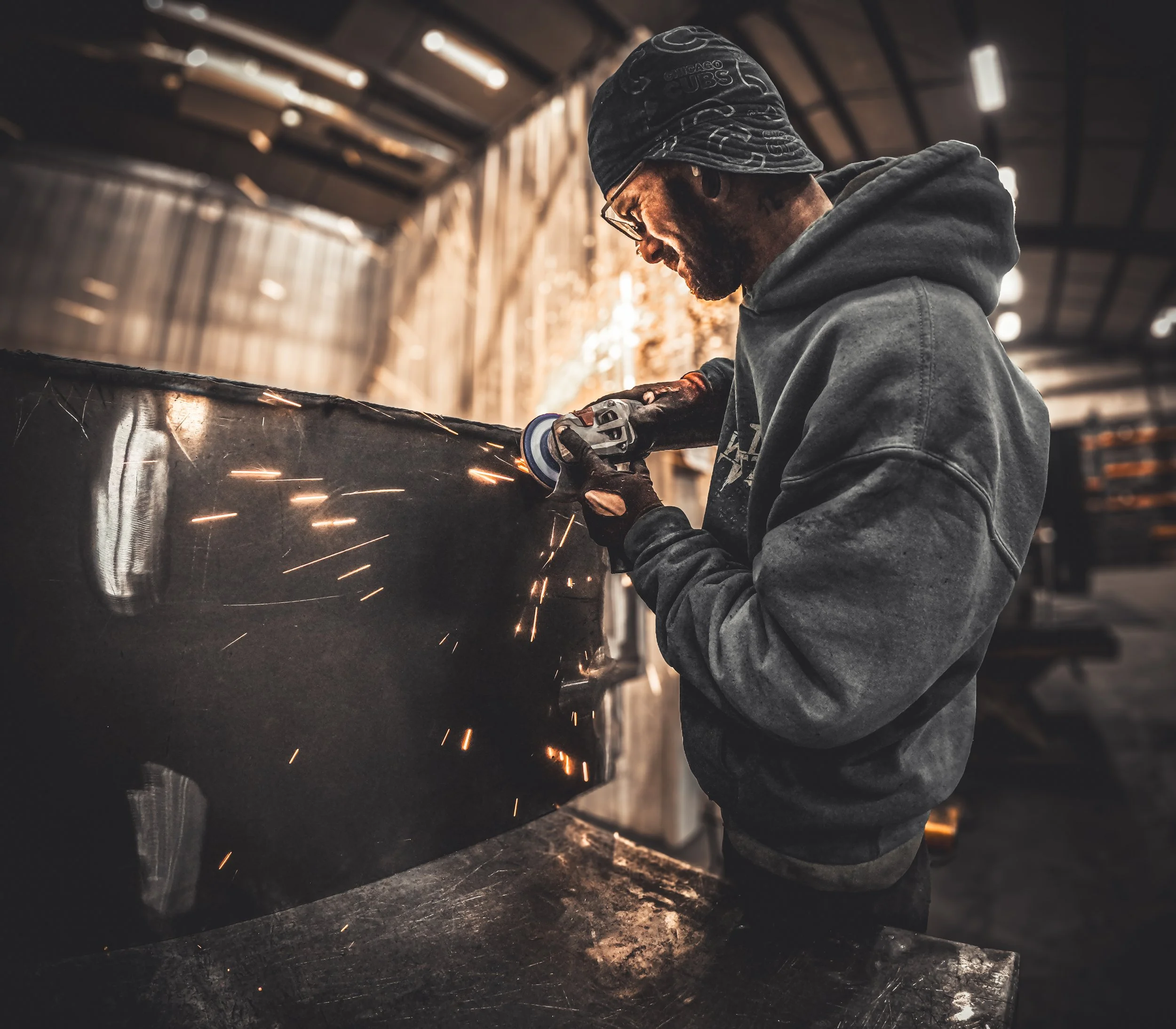 Using abrasive wheels or belts, controlled pressure is applied to the metal surface to remove excess material, weld spatter, or imperfections. The process is carefully managed to achieve the desired finish.